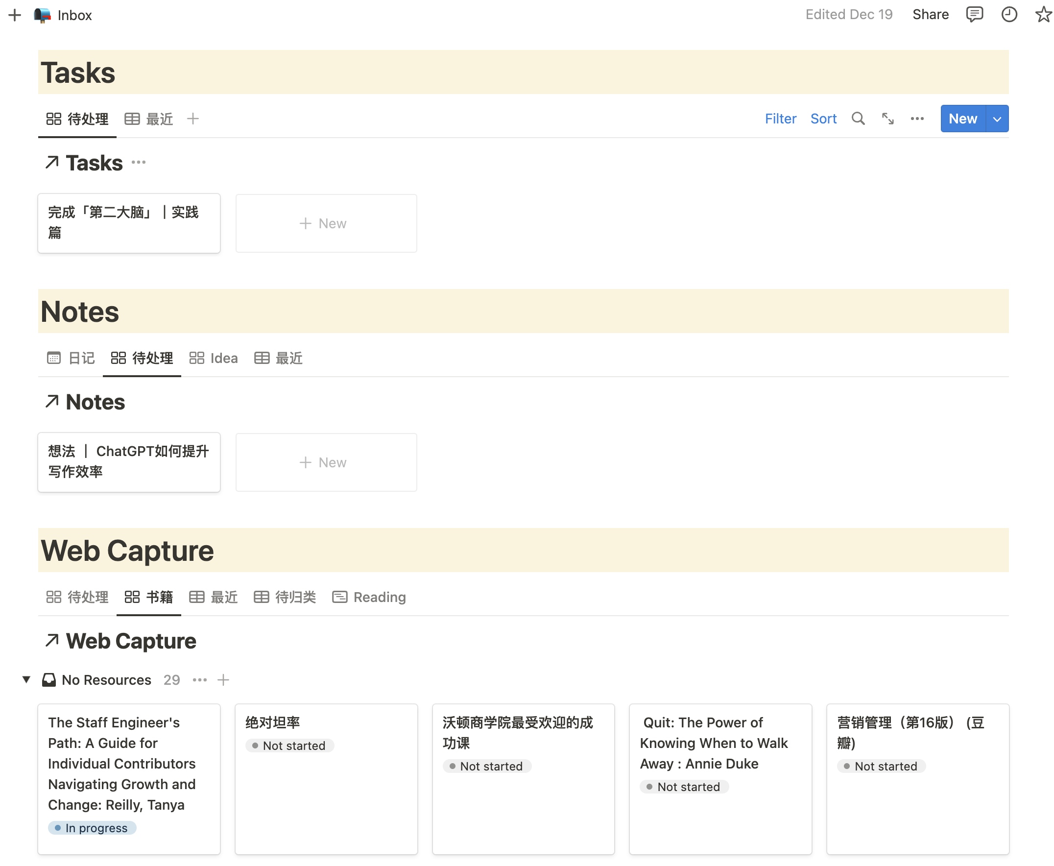 - Notes:区别于Web Capture中的信息来自互联网,Notes主要是个人“原创”的内容,包括灵光一现的想法、思考总结、日记、决策等等。