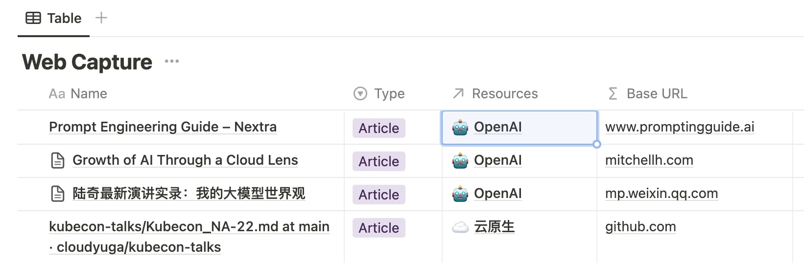 - 通过「Resources」Relation就可以实现前面提到的关联。这一步非常重要,便于后续基于「Resources」进行文章的回看。比如想要加深对于大模型的认知,我可以基于「OpenAI」这个Resource对所有Web Capture盘点一下,然后个人的思考认知可以输出到「Notes」中(或者到公众号里面,输出倒逼输入)。