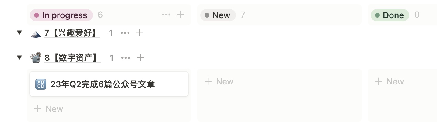 Projects也是通过Database组织的,并且按照Areas和Status进行分组。如上图是一个Q2公众号写作的Project,这个是基于自己写作的年度OKR拆解下来的(其他Projects偏私人化就没截图)。