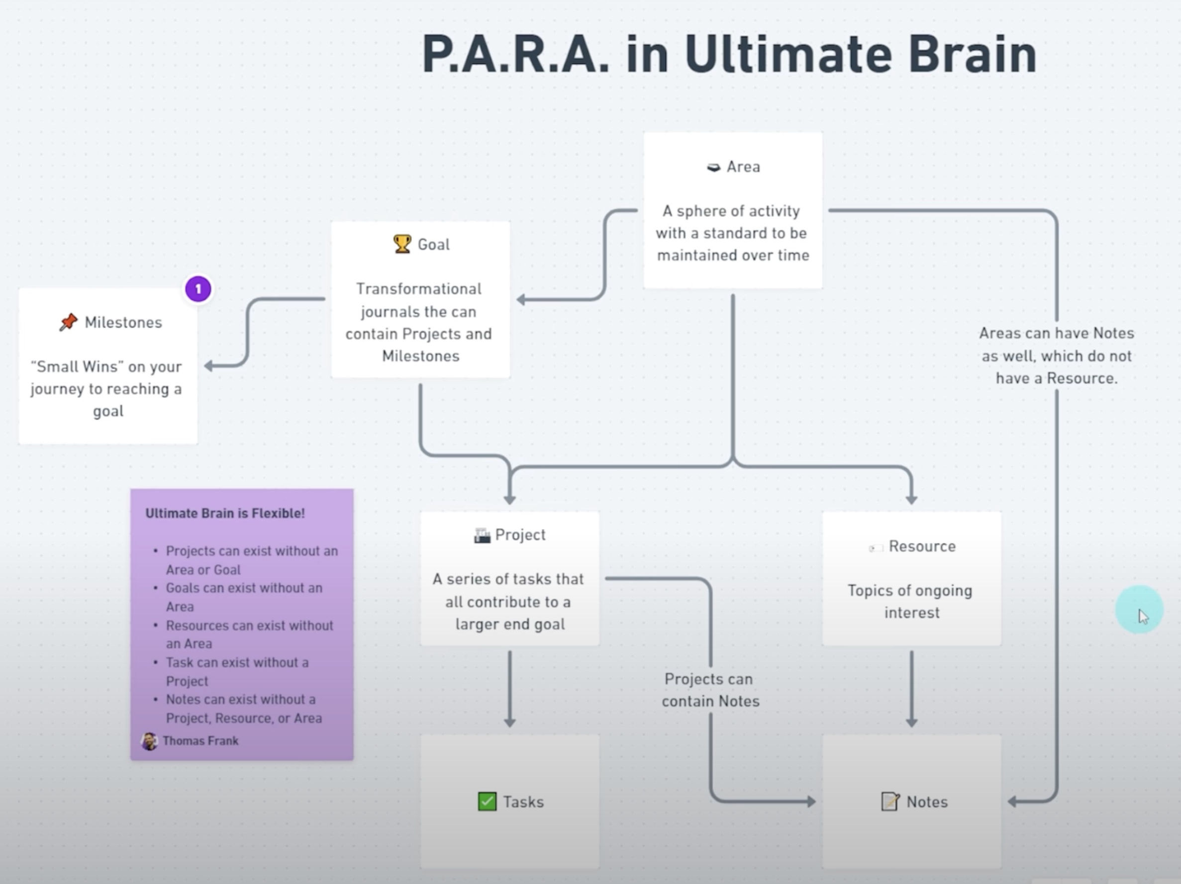 上图是另外一位分享P.A.R.A的Youtube博主绘制的示意图,他添加了几个元素,包括和Project相关的Goal/Milestones/Tasks,以及和Resource相关的Notes。核心的内在关系和我们上面提到的基本是一致的,主要是Project和Resource对于Area的支撑关系,一个是提升Area的行动,一个是提升Area的资源(或者说一个是实践支撑,一个是理论支撑)。